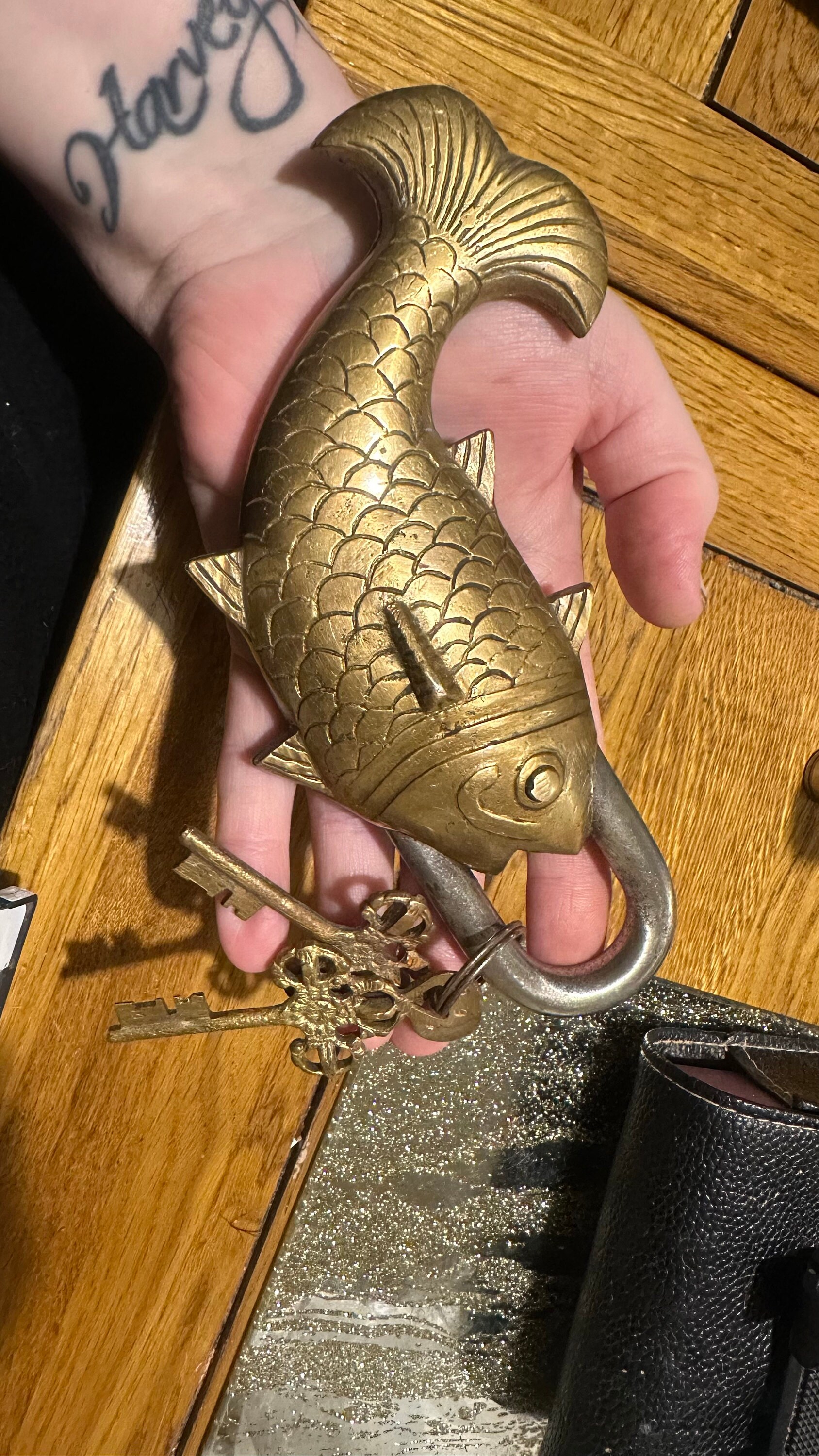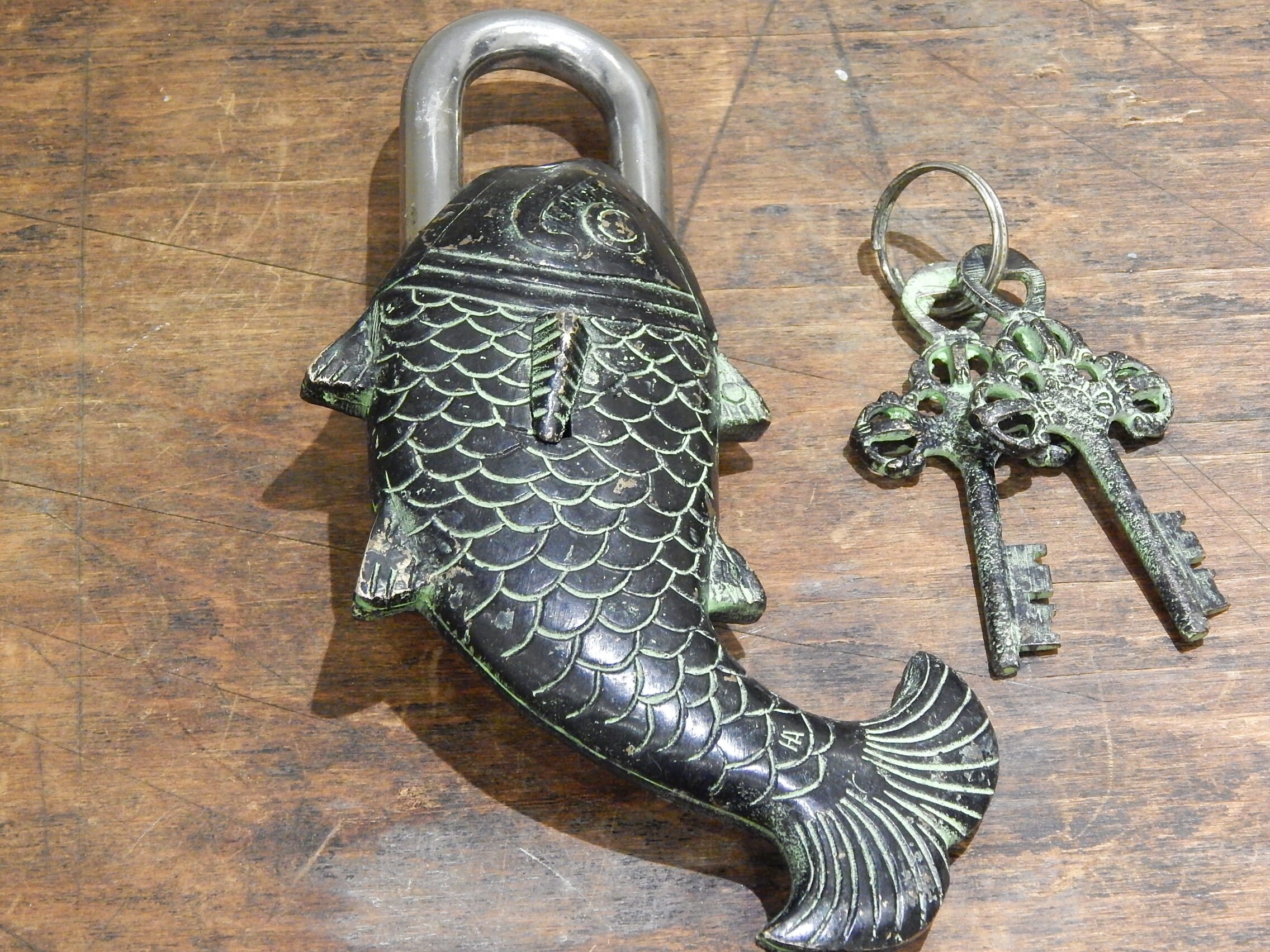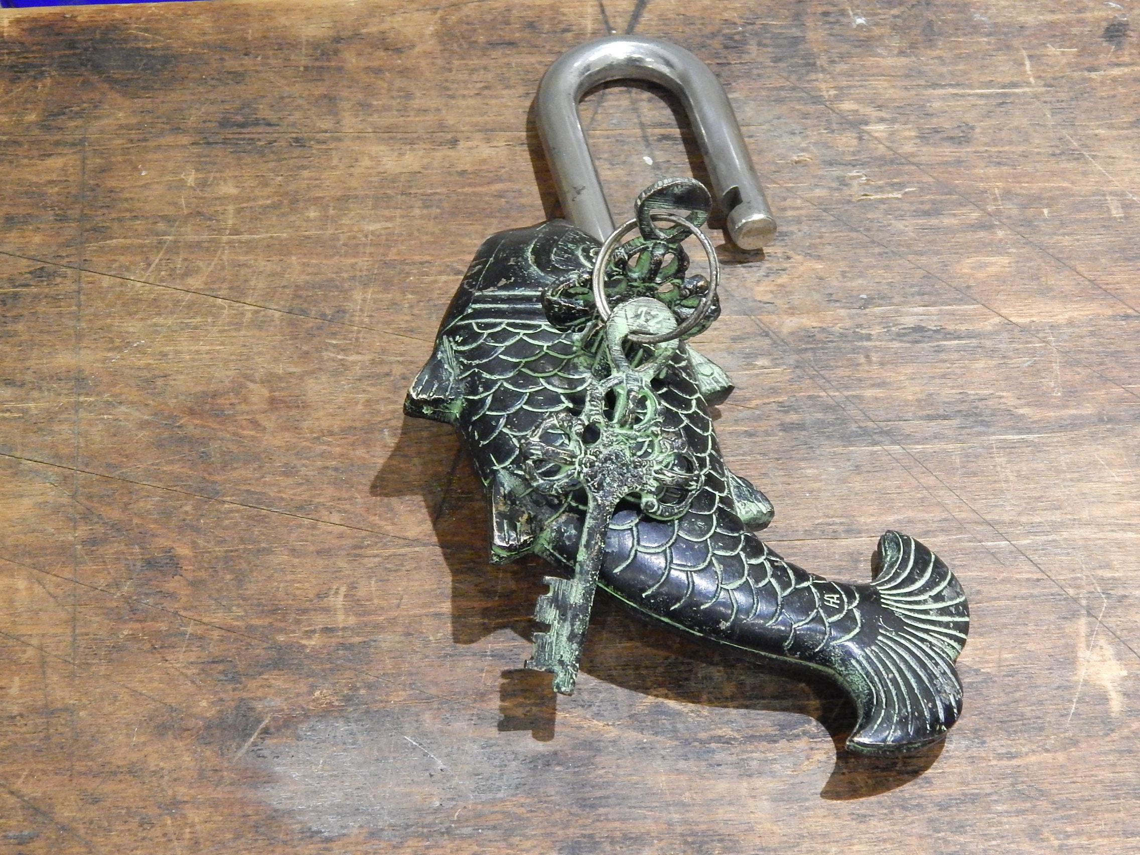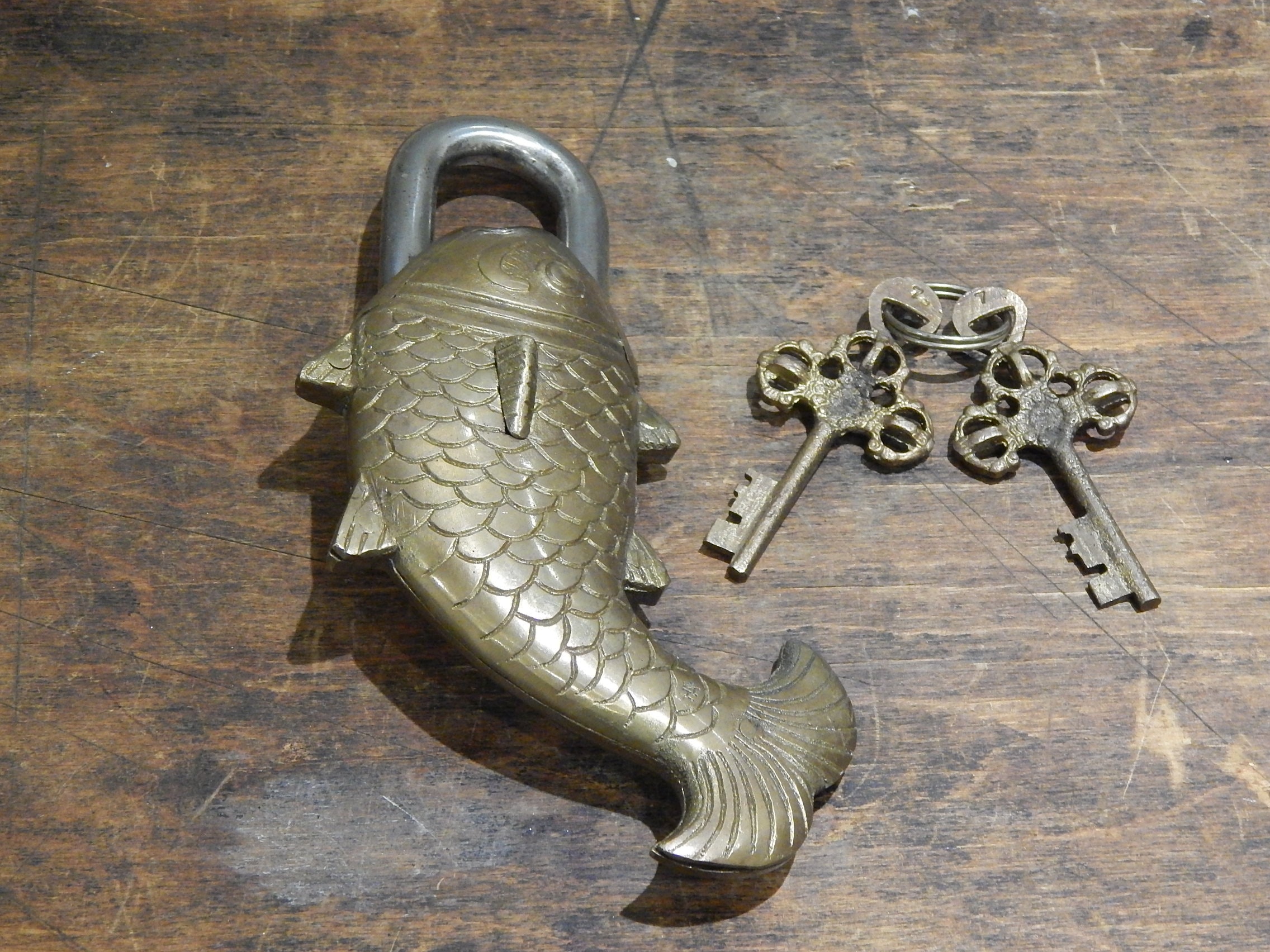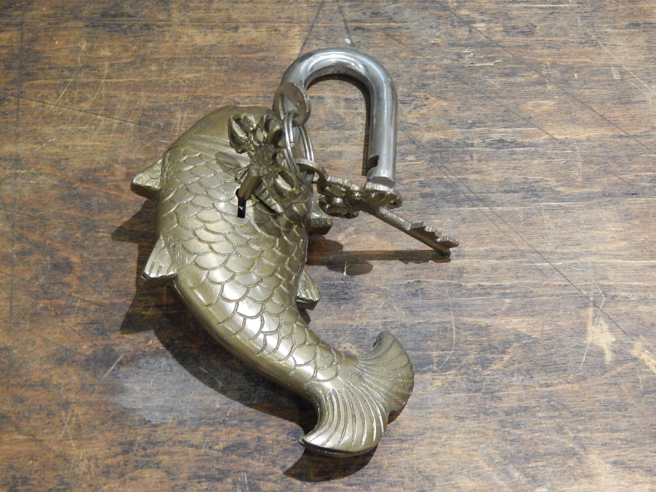 This item is very quirky with the key hole hidden behind the fin on the side. In order to open the user needs to turn the key until it stops, push hidden button which is the eye, the key turns one more turn before it will open. To lock the item just turn the key.